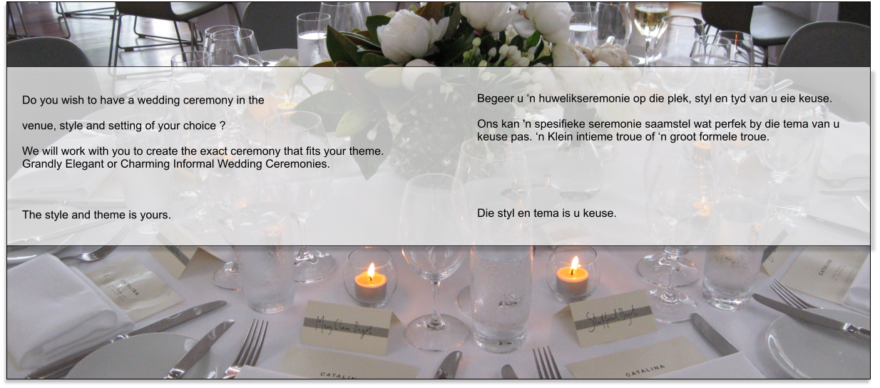 Ons is gelisensieerd om Suid Afrikaners en enige Nie Suid Afrikaners se Huwelike te voltrek.